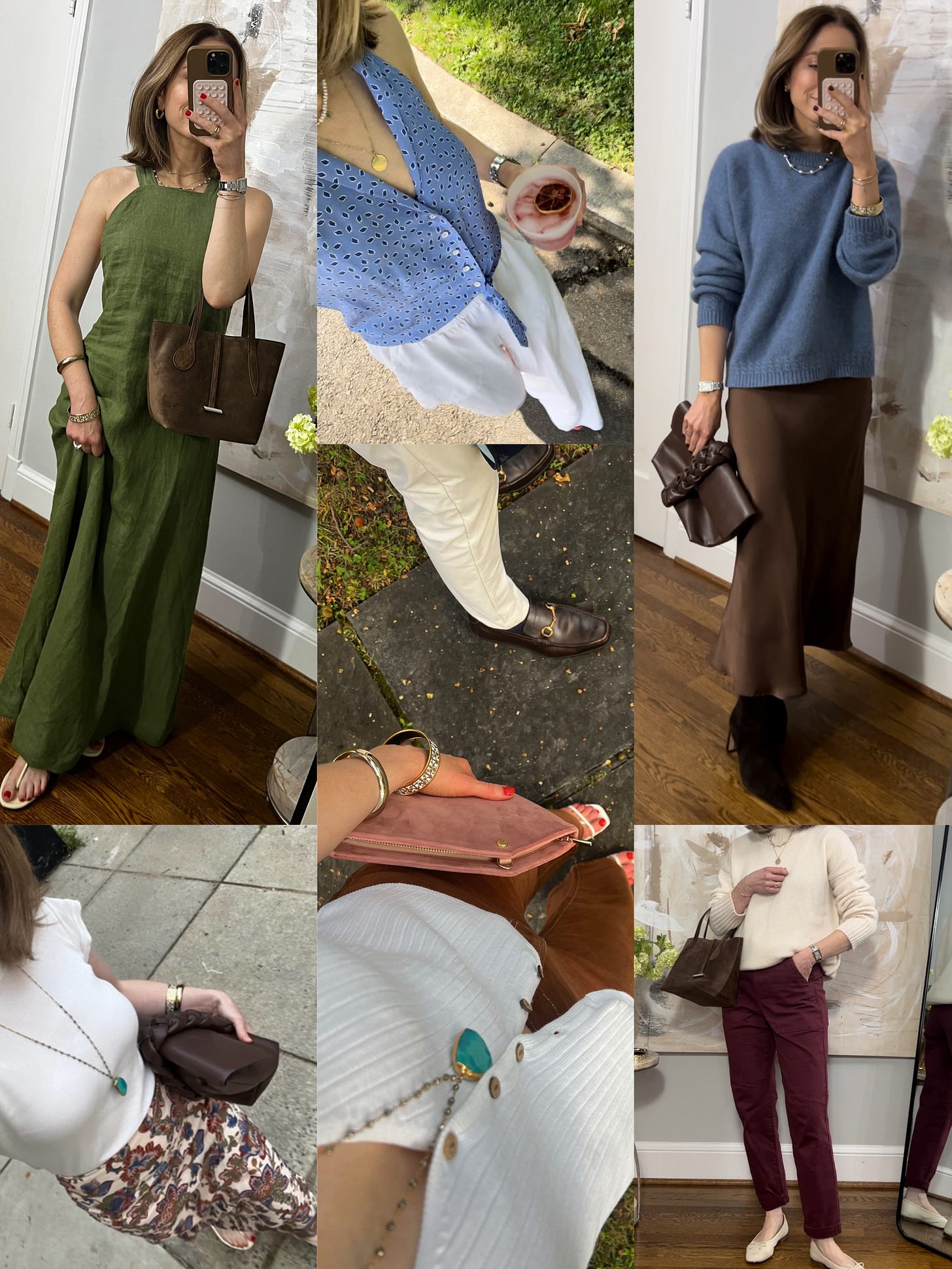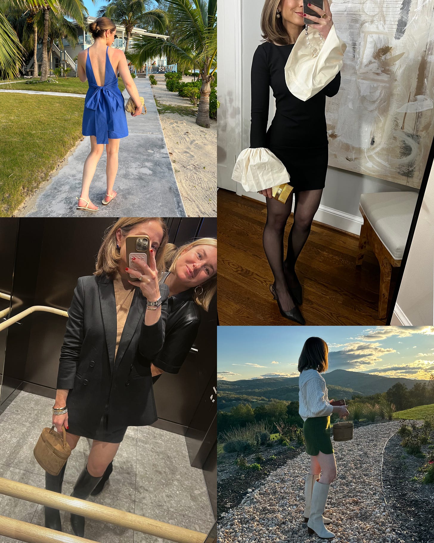 The mini blue dress is from BONDI BORN, a great brand for vacation wear. Their pieces can be a little pricey, but you can feel that quality in the weight of the fabric and construction — they’re pieces I will wear for years to come; The mini black dress from STAUD is truly a DREAM. It was one of those “had to have” pieces for me. The black leather mini skirt in the bottom left was a trusty essential through Fall. The wool green mini skirt is from Sezane — it’s simple, but it adds in vibrant, autumnal color and texture to any outfit. Neutrals aren’t a requirement for styling a chic and effortless outfit. Neutrals make up the foundation of my wardrobe, but in 2023, I started to weave in more color and printed pieces. This challenged me to try new color combinations and stretch my personal style. When you find a color or print that speaks to you, lean into it! The printed skirt below had a chokehold on me that I couldn’t shake and I was thrilled once it was mine. I can’t wait to wear it again this year.