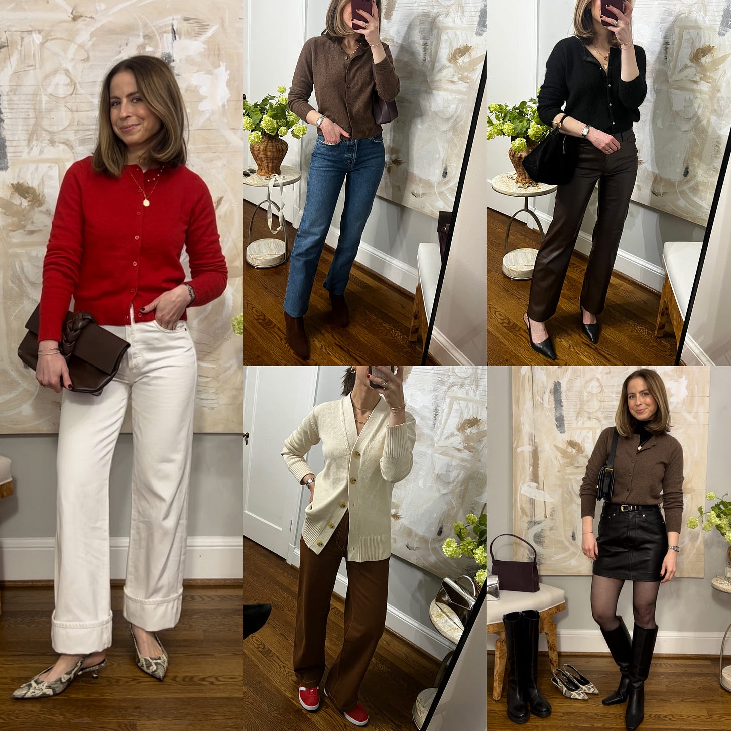 Cardigans, cardigans, and more cardigans. Layered over a base or worn solo, tucked or untucked, cardigans found their way into many of my outfits in 2023. I often wore a cardigan instead of a button up or t-shirt — I found the knit to give me a sense of cozy comfort and I love the added texture. More cardigan outfits to come in 2024!