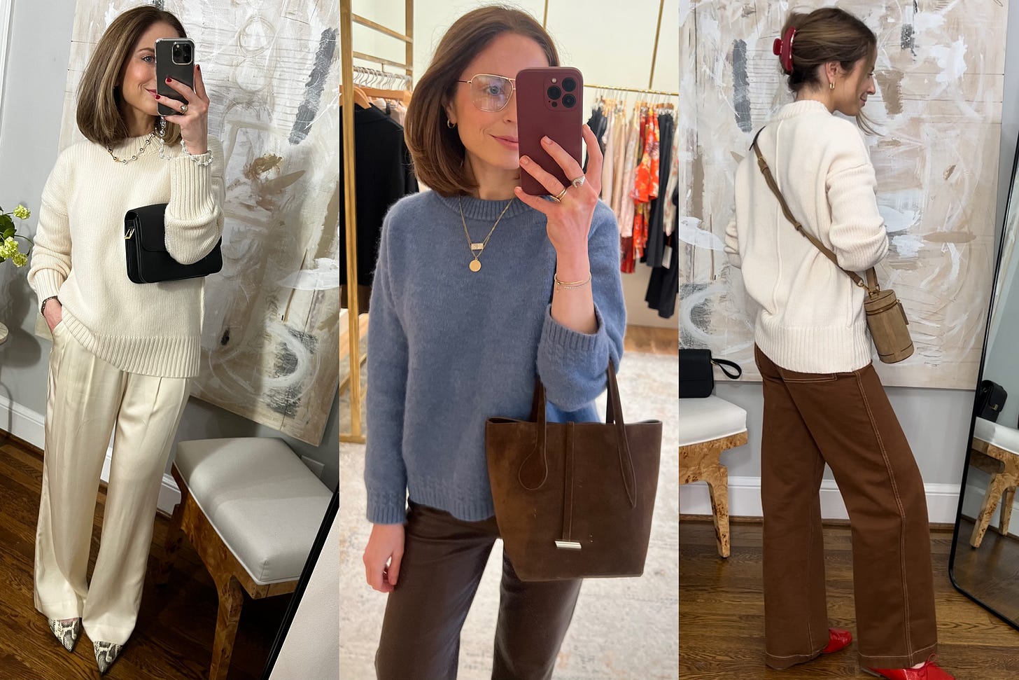 The Marin sweater from La Ligne, styled in the ivory above is the perfect silhouette and length for me to style untucked. New customers can use code KELLY10 to save. The blue sweater is from Sezane, but recently sold out in most sizes. I don’t always need to add a 3rd piece to an outfit. If you’re unfamiliar with that term, a 3rd piece is considered to be the finishing item that makes an outfit more interesting — some classic examples are a jacket/blazer/coat, hat, scarf, belt, or statement jewelry. This fixation with “needing a 3rd piece” was preventing me from styling the more simple outfits that I was naturally drawn to. A 3rd piece does have it’s place, but it’s not an absolute. A simple look can feel finished just by how the pieces are actually styled together or how I decide to style my hair that day.